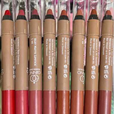 رژلب مدادی گینو ساخت کشور آلمان بوده و از کیفیت بالایی برخوردار است. این رژلب مات حالت نرم و ابریشمی داشته و بعد از اولین استفاده به راحتی نظر شما را جلب خواهد کرد. این رژلب مدادی در 8 رنگ ارائه شده است.
